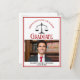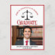 Este clássico cartão postal de anúncio de formatura na Faculdade de Direito personalizado em vermelho e preto apresenta uma tipografia sofisticada para um formando da turma de 2024 acima da foto do seu aluno. Personalize com o ano de formatura sob as balanças da justiça e fotografia para cartões postais personalizados de advogado ou advogado.