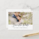 Esta foto moderna de script salve o cartão de data com a sua foto especial sobreposta com um script elegante, salve a data acima de seus nomes, data e local na tipografia branca. O inverso tem os detalhes adicionais da data, incluindo o site do casamento, com seu endereço de retorno e espaço para o endereço do destinatário. Projetado por Thisnotme©