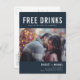 Cartões-postais engraçados de "save the date" de casamento em um moderno tom azul-marinho com design de texto branco e sua foto personalizada que diz "Drinks grátis (e estamos nos casando)". Personalize a frente do cartão com sua foto horizontal (corte para retângulo antes de fazer o upload para melhores resultados). Adicione seus nomes, data e local do casamento. Personalize o verso do cartão com os detalhes do seu casamento.