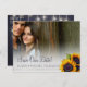 Cartão de salvar data de casamento moderno de outono com buquês de girassóis e luzes cintilantes em fundo de quadro-negro azul-marinho no verso. Insira suas informações na frente e no verso do cartão. --------- Perfeito para um casamento moderno e elegante de verão ou outono com girassóis em jardim ou quintal.