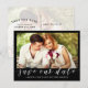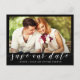 Esta foto moderna do casamento salva o cartão postal da data apresenta um design moderno com sua foto enquadrada em preto e uma camada de roteiro branco que lê "Salvar nossa Data" com seus nomes para personalizar. Na parte de trás do postal estão mais detalhes do dia do seu casamento para personalizar com uma foto esmaecida no fundo para você mudar para o seu. Os melhores votos para o seu noivado e casamento! Desenhada por Susan Coffey.