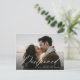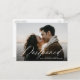 Precisa alterar a data do seu casamento? Nossos elegantes cartões-postais de adiamento de casamento "change the date" são perfeitos para ajudar a notificar os convidados da nova data do seu casamento. O cartão-postal "change the date" apresenta "Postponement" em uma sobreposição de texto em escrita caligráfica branca com a foto do seu noivado na horizontal. Personalize o cartão-postal adicionando seus nomes, endereço de devolução, detalhes do casamento, site do casamento, etc.
