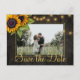 Girassóis amarelo laranja e cordas de luzes cintilantes em madeira de celeiro elegante marrom escuro foto salvar a data do cartão postal de casamento. +++++++++ Fácil de personalizar com seus nomes e texto! ++++++++++ Adequado para casamentos temáticos de verão ou outono / jardim quintal rústico ou casa de fazenda.