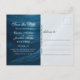 This elegant gothic wedding save the date announcement postcard features a skeleton couple wearing blue wedding attire in a romantic setting with the moon and ocean behind . The back of the postcard has a matching image and your wedding details. Image generated with AI.
