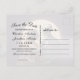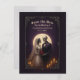 This gothic wedding save the date postcard features a skeleton couple wearing a wedding outfit with red roses and candles in a romantic setting in front of a lake at night with the moon in the background. The back of the postcard has the image of the skeleton couple and fill in your wedding details. Image generated with AI.