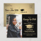 Se circunstâncias inesperadas causaram um adiamento ou cancelamento de sua festa de formatura, informe a família e os amigos sobre a mudança nos planos com esses modernos negros e ouro para salvar os novos convites para cartão-postal de data. Todas as fotos e textos são simples de personalizar. Design apresenta fundo e boné de formatura metálico falsa dourado, e caligrafia de script manual. Modelo inclui o nome do formando de tipografia na moda, ano de aula e escola, e uma foto de sua escolha, como uma foto de mais velho ou imagem da cerimônia de início. Observe que o ouro é impresso a cor, não a folha metálica. Este elegante cartão de anúncio de graduação é uma forma na moda e chic de começar sua celebração especial do dia e convidar novos convidados para salvar a nova data remarcada. Parabéns ao formando!