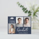 Cartão postal de marinho azul escuro moderno, com 3 fotos e "Formando" em um roteiro branco negrito contemporâneo. Adicione o nome do formando, ano de aula e segundo grau ou faculdade em tipografia branca simples.