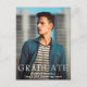Cartaz de anúncio de graduação de garoto moderno com um design simples e masculino com "Formando" em letras grandes e negrito junto com o nome do formando, o ano e o nome da escola sobre sua foto vertical de sangria de cheio favorita. A parte traseira tem sua mensagem/convite de festas pessoal e seu endereço de retorno em um marinho azul sobre um fundo branco.