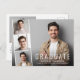 Cartão postal de anúncio de graduação moderno minimalista com a foto do graduado sobreposta com uma faixa de três fotos quadradas menores e "Graduado," o nome, a escola e o ano de conclusão em tipografia branca simples. No verso, adicione uma foto adicional e uma mensagem personalizada.