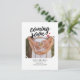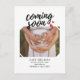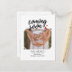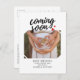 Uma ótima maneira de anunciar suas notícias emocionais com um anúncio de gravidez com foto favorita que tem uma sobreposição de texto em negrito preto com a frase "chegando em breve". Personalize com seu nome e a data prevista para o parto.