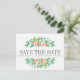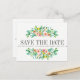 Concebido para combinar com a nossa coleção de casamento floral aquarela Tropical Hibiscus, rodeado por delicadas flores de verão pintadas e folhas tropicais sobre um fundo branco, este design é atraente e muito bonito. O cartão de "save the date" moderno e simples aparece no centro entre a folhagem e um modelo de cartão postal está no verso. Todo o estilo de texto, cores e tamanhos também podem ser modificados para atender às suas necessidades