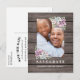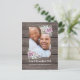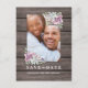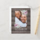 Cartões-postais de "save the date" com charme de jardim campestre apresentando um fundo de celeiro de madeira rústica, uma foto dos noivos, uma exibição floral de canto com suculentas e um modelo de texto de casamento fácil de personalizar.