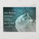 Casamento salve o cartão postal com uma fotografia de um lindo lobo peludo e peludo de cinza. Ao fundo está uma floresta escura com árvores. Mística mágica.