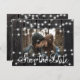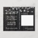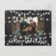 Cordas de luzes brilhantes brancas e um roteiro de tipografia de letra-chica em um fazer de madeira marrom-escura uma foto chic salvando a data cartão-postal do casamento. +++++++ Fácil de personalizar com a sua imagem, nomes e texto! ++++++++ Adequado para outono ou inverno país rústico, fazenda, montanhas, terras maravilhosas ou casamentos temáticos de Natal.