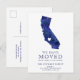 envie seu novo endereço para amigos e família com este moderno mapa azul de aquarela marinho do estado da Califórnia com tipografia moderna. Anúncio perfeito. Mova o coração para a sua localização.