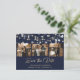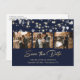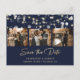 Foto personalizada e elegante de casamento azul-marinho e dourado salve os cartões postais de data com uma fonte moderna de escrita. Nosso casamento salva a data mostra uma coleção de fotos de 3 imagens contra um fundo azul marinho adornado com luzes de cordas. Personalize facilmente esta foto, salve o cartão-postal com suas imagens e detalhes de casamento, incluindo um site de casamento, se desejar. Para pedidos personalizados, envie-nos uma mensagem.