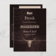 Textura marrom rústica imprimir caveira de touro. País western cowboy comer beber casado diversão design de madeira anúncio de casamento postal. Use um pouco de humor com esses convites exclusivos, fofos e engraçados em estilo fazenda. Comer, Beber, porque estamos nos casando pode ser personalizado. Legal, moderno, estilo antigo oeste selvagem vintage antiguidades fazenda animal. Personalize a fonte e a tipografia. Direitos autorais da imagem Marg Seregelyi Photography.