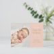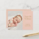 Cartão moderno de anúncio de nascimento de menina bebê com script dourado, para apresentar seu lindo bebê recém-nascido. A frente apresenta uma foto do seu bebê junto com texto chique dourado e branco para o nome do seu bebê e estatísticas de nascimento em um painel de cor-de-rosa que você pode personalizar para a cor de sua escolha. O verso tem estrelas douradas em cordas em um fundo cor-de-rosa correspondente. Criado por Thisisnotme©