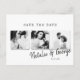 Um casamento de fotos de na moda mínimo moderno salve o cartão de data. Com espaço durante um ano em revisão ou mensagem no verso.