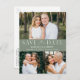 Anuncie sua data de casamento com esta na moda, foto moderna, salve o cartão postal da data. O design apresenta três das suas fotografias de noivado favoritas com "Save the Date" (Salvar a data) apresentadas em fontes de serif e script brancas contra um fundo verde sábio. Personalize a frente do minimalista e salve os anúncios de data adicionando seus nomes, data e local do casamento. A opção salvar a data do cartão postal reverte para exibir seu endereço de devolução e detalhes do casamento. A simples salvação do anúncio de data é perfeita para qualquer tema de casamento.