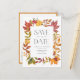 Este cartão postal de salvar a data do outono apresenta um design quente de outono com folhagens em aquarela em tons de ferrugem, âmbar e verde-oliva, emoldurado com um sutil acento dourado. Criado em um formato conveniente de cartão postal, oferece uma maneira simples e elegante de anunciar a data do seu casamento sem a necessidade de envelopes. Adicione seus nomes, data e local do casamento para torná-lo pessoal e significativo. A combinação de arte sazonal e design elegante torna-o uma ótima escolha para casamentos rústicos, ao ar livre ou com tema de outono. É uma maneira bonita e prática de deixar seus convidados saberem que devem marcar seus calendários.