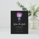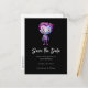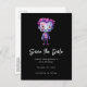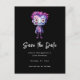 Salve o cartão postal da data com uma ilustração fofa. Monstro de Frankenstein com cabelo rosa e roxo e um terno e gravata elegantes.