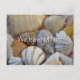 Bonito conchas texturizadas movendo cartão postal. Anuncie uma mudança para uma área costeira ou condomínio de praia. O texto "Mudamos" na frente é fácil de mudar para um solteiro. Personalize o texto no verso com o(s) nome(s) e o novo endereço sobre uma imagem de água em shimmering.