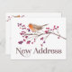 Lindo pássaro maravilhoso em um galho de árvore com frutas. Estilo de arte em aquarela com tipografia moderna. O cartão perfeito para mudança de endereço ou novo endereço para enviar a familiares, amigos e clientes comerciais.
