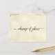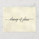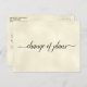 Este belo cartão postal colorido de marfim é uma maneira simples, mas sofisticada, de informar aos seus convidados se você precisar alterar ou adiar seus planos de casamento. A frente diz "mudança de planos" em caligrafia elegante, e o verso tem espaço para uma nota personalizada onde você pode explicar a situação aos seus convidados. O design é feito para casamentos, mas é versátil o suficiente para ser usado em qualquer evento ou celebração.
