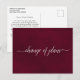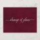 Este belo cartão postal foi projetado para manter seus convidados informados caso você precise cancelar, alterar ou adiar os planos de seu casamento. Ele apresenta um design simples, mas elegante, com o texto "mudança de planos" escrito em caligrafia sobre um fundo de mármore burgundy. O verso é uma nota personalizada onde você pode explicar todos os detalhes aos seus convidados. Embora projetado para casamentos, este cartão é versátil o suficiente para ser usado em qualquer evento ou celebração.