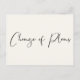 Se as circunstâncias exigirem que você reduza o número de convidados e diminua a quantidade de pessoas no seu casamento, você pode informar sua lista de convidados estendida com este moderno e minimalista, porém elegante e sofisticado, anúncio de mudança de planos de casamento reduzido em cartão postal na cor creme claro. "Mudança de Planos" está escrito em um estilo de letra elegante na frente e você pode personalizar a mensagem de redução do casamento em mais detalhes e adicionar qualquer transmissão ao vivo da cerimônia, celebrações futuras e informações do site do casamento no verso.