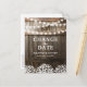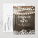 Cartão postal de mudança de data de casamento rústico com fundo de barril de carvalho country, luzes cintilantes, flores de respiro de bebê, seu monograma e um modelo de salve a data. Encontre outros cartões de mudança de planos em www.zazzle.com/special_stationery.