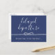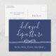 Mudou a data do casamento? Informe seus convidados com este cartão postal azul-marinho com "partida atrasada" escrito em uma fonte fina acima de uma corda branca amarrada no símbolo do infinito. Adicione as novas informações do casamento no outro lado.