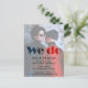 Nós Aceitamos, é um conjunto de papelaria de casamento ideal para anunciar a data do casamento de outono. O cartão-postal mostra gravadas as palavras nós aceitamos em uma sobreposição meio transparente sobre uma foto romântica da noiva e do noivo. A cena da foto é um cenário urbano contra um muro em erosão com o casal vestido de vermelho e azul.