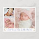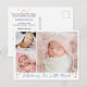 Modernas 3 fotos em uma grade com estrelas douradas, apresentando nosso pequeno milagre em escrita manual com informações pessoais no verso do cartão postal.