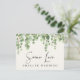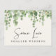 Se as circunstâncias exigirem que você reduza o tamanho e diminua o número de convidados em seu casamento, informe amigos e familiares que não poderão comparecer com este lindo e moderno cartão-postal de anúncio de casamento reduzido em creme claro, apresentando aquarelas suaves de folhas de eucalipto verde claro com detalhes em dourado e "Mesmo Amor, Casamento Menor" escrito em uma fonte estilosa e tipografia moderna na frente. No verso, você pode personalizar facilmente a mensagem de redução do casamento com mais detalhes e adicionar qualquer cerimônia virtual e celebrações futuras.