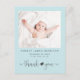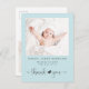 Um obrigado simples e doce, neutro em relação ao gênero, você faz o anúncio do cartão postal com a tipografia moderna das cinzas suaves contra um fundo azul-marinho pastel. A frente apresenta a foto de seu bebê recém-nascido, o nome do cheio, a data de chegada e as estatísticas de nascimento, e o "obrigado você" escrito em um roteiro de na moda com um coração juntando as duas palavras. No verso do cartão-postal você pode adicionar outra foto, uma obrigado que você envia, e nomes de pais e irmãos sob uma seta de coordenação fofa com um coração no meio.