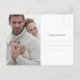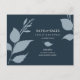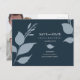 Este casamento do orçamento salve a data do cartão postal com folhas azuis empoeiradas minimalistas com a noiva e detalhes do noivo em branco sobre um fundo azul da meia-noite. A simples placa reverte para incluir a foto e o espaço do seu casal para gravar no endereço do destinatário. Para ver toda a linha de papelaria azul do marinho, visite www.zazzle.com/dotellabelle
