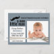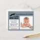 Anuncie o nascimento do seu filho recém-nascido com este novo cartão postal de anúncio de bebê fofo! Perfeito para amigos e familiares fora da cidade, que podem ser facilmente enviados pelo correio sem se preocupar em compartilhar informações pessoais demais. Fundo azul-acinzentado macio com área fotográfica em quadros brancos e quadrado estilo bloco de notas com os detalhes importantes do nascimento e sobrenome na sombra correspondente. Um simples gráfico preto de bigode foi adicionado com uma fita falsa de veludo amarrada em um arco que envolvia os detalhes e as áreas fotográficas. Nota: Este é um cartão-postal impresso em formato simples, o produto acabado NÃO terá fitas ou camadas, etc. Carregue sua própria foto e redimensione ou reposicione conforme necessário para preencher o quadro quadrado branco revestido.