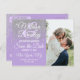 Este convite de casamento glamouroso, chique e elegante com brilho prateado impresso em falso sobre um fundo roxo lavanda escuro é perfeito para o evento sofisticado. Este design clássico e sofisticado é perfeito para o casal que está se casando e é moderno e elegante. Personalize com sua própria mensagem na frente, bem como um monograma inicial personalizado no verso. Todo o design de impressão de foto.