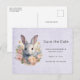 Save the date postcard with a sweet and adorable watercolor image. A bunny rabbit with white and gray fur. A garland of carnation flowers in pastel colors of pink and peach. A cute Easter, birthday or baby shower image for bunny rabbit lovers.