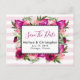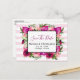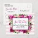 Um cartão postal de casamento com um buquê floral composto por rosas cor-de-rosa claro e papoulas cor-de-rosa escuro com muitas folhas verdes exuberantes. Uma moldura retangular sobreposta para colocar o seu texto personalizado dentro. O fundo é um padrão listrado de rosa pastel suave. O verso do cartão postal também tem todas as suas informações personalizadas.