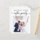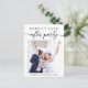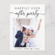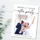 Convite de recepção e anúncio de casamento privado ou fuga moderna em cartão postal. A frente apresenta sua foto, "Festa Feliz para Sempre" em uma mistura de tipografia simples e um script moderno com floreios e seus nomes e data de casamento. No verso, personalize seu anúncio e convite e adicione seus nomes em um script semelhante a uma assinatura.