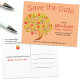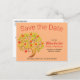 O anúncio da reunião da família "Salvar a Data" à direita e uma macieira à esquerda. Personalize as informações de modelo para frente e verso, remova o texto e/ou clique em personalizar para selecionar uma cor de fonte, tamanho e estilo que você preferir.