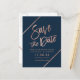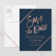 Cartão Postal De Anúncio Rosa ouro azul marinho script salvar a data casame