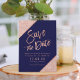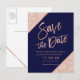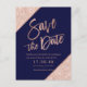 Tipografia em rosa ouro em bloco de cor brilhante azul marinho personalizável, e listras geométricas falsas de rosa ouro chique salvar a data do casamento, perfeito para um casamento elegante e sofisticado,