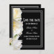 Um simples e simples buquê floral de rosa branca sobre fundo preto e fronteira branca tradicional guarde a design de casamentos brancos de jardim de verão para combinar com a sua suíte de papelaria de casamento e com outras essências de noiva. Este casamento sofisticado e na moda elegante salva a data, pode ser facilmente personalizado com os nomes da noiva e do noivo para os modelos de texto para criar seu próprio casando personalizado feminino único, salvar a data para suas ocasiões, eventos e celebrações especiais de casamento. Visite a LOJA PERSONALIZED_ WEDDINGS para combinar conjuntos coordenados de casamento. PERSONALIZAR para ajustar o texto e a fonte.