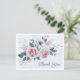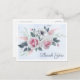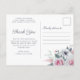 Elegante design de cartão postal de agradecimento de casamento com flores de aquarela rosa e branca em um fundo azul claro.