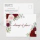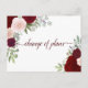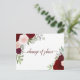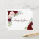 Este lindo cartão postal é uma maneira elegante e sofisticada de informar aos seus convidados se você estiver na infeliz posição de ter que alterar ou adiar seus planos de casamento. Ele apresenta um design floral em aquarela pintado à mão com rosas e folhagens em tons de borgonha, vermelho e rosa rosado. A frente diz "mudança de planos" em caligrafia elegante, e o verso tem espaço para uma nota personalizada onde você pode explicar a situação aos seus convidados.