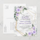 Moderno e trendy, este lindo design de cartão postal de Adiar a Data de casamento apresenta um falso geométrico dourado adornado com flores roxas lilás lavanda, folhagens verde azuladas em aquarela e apresenta letras à mão da tendência. O verso do cartão postal permite seu endereço de retorno e mensagem pessoal. Copyright Elegant Invites. Todos os direitos reservados.